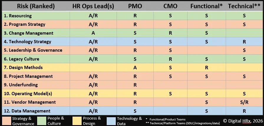 Let’s consider these proficiency risks/capability gaps in the context of the traditional digital transformation work streams (talent) that deliver these programs. They generally include HR Operations leadership (i.e., program sponsors, Steering Committee), Project Management, Change Management, Functional and Technical. When we map the 12 stack-ranked proficiency risks against the work streams, we can see where digital transformation programs are most likely to break down (see Figure 1). HR Operations leadership and Project Management teams appear to have primary accountability and responsibility for the proficiency risks.